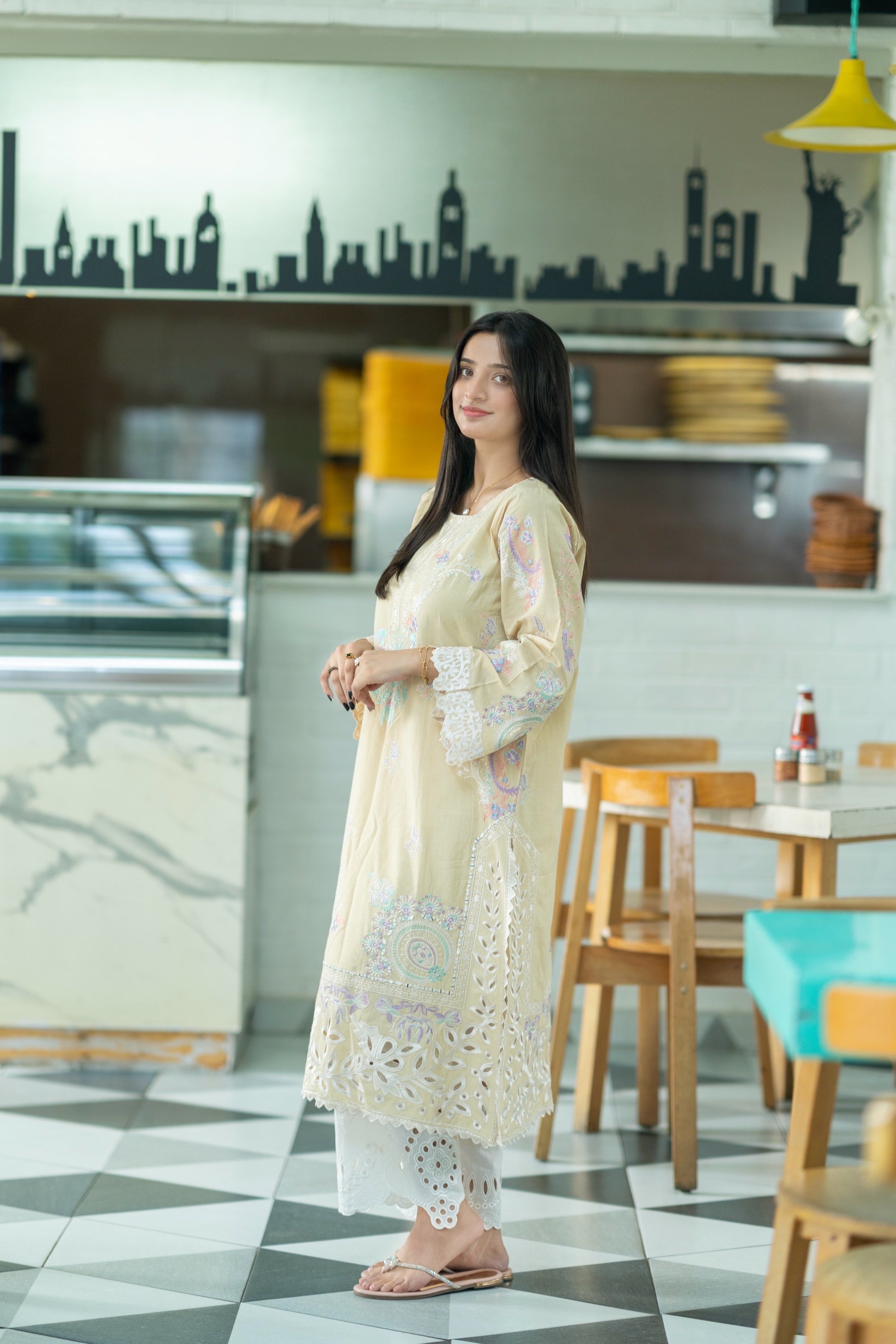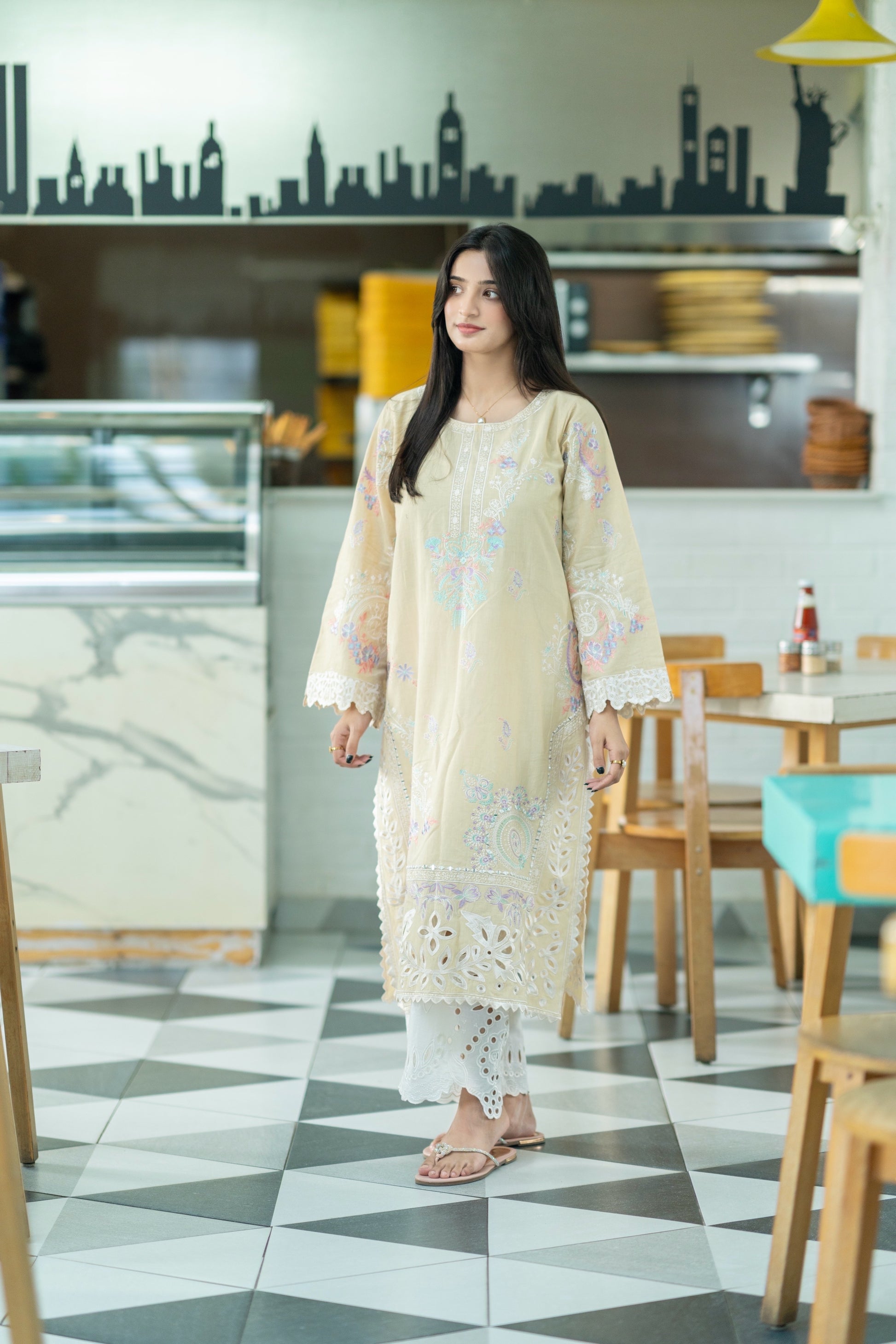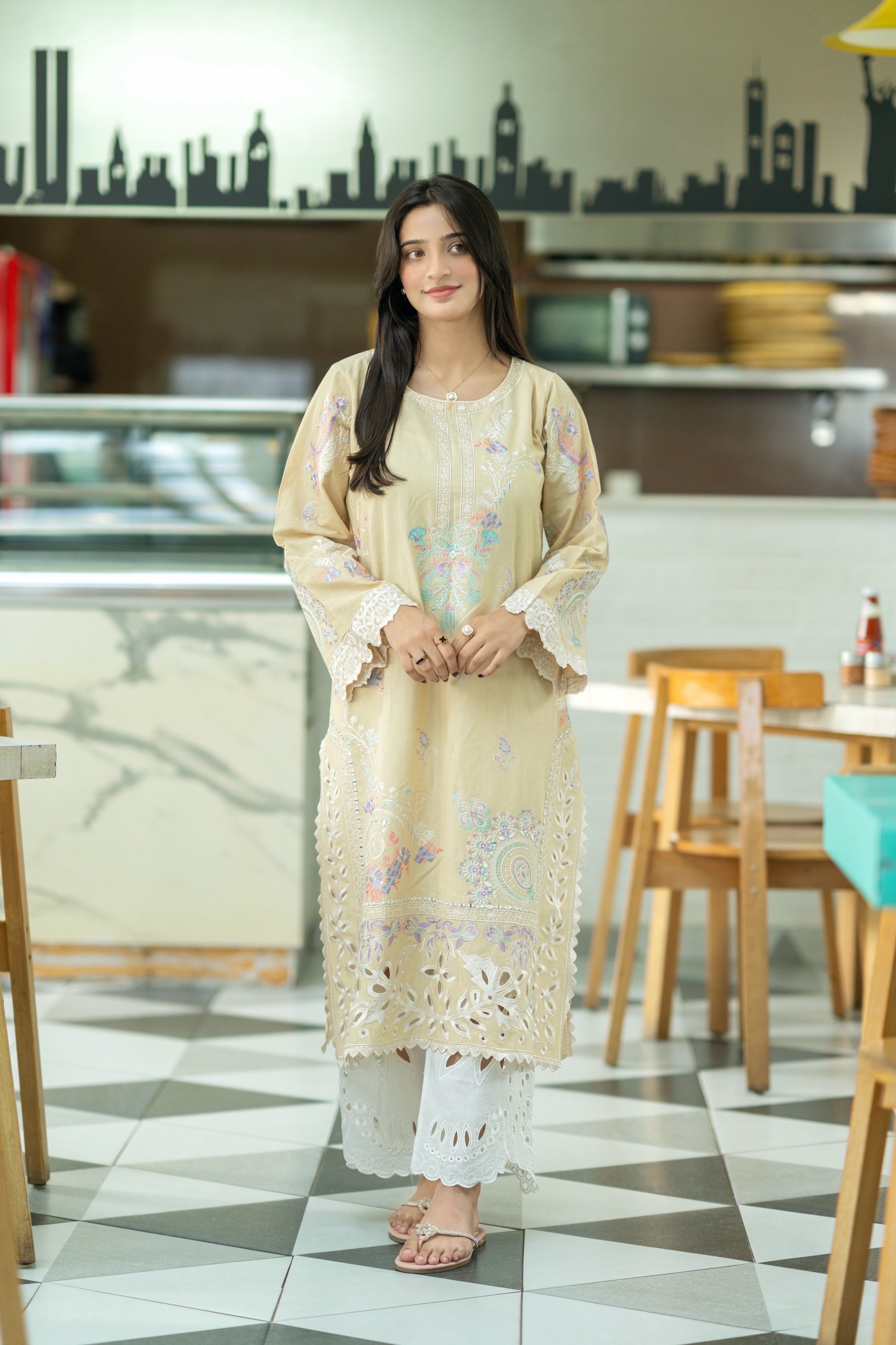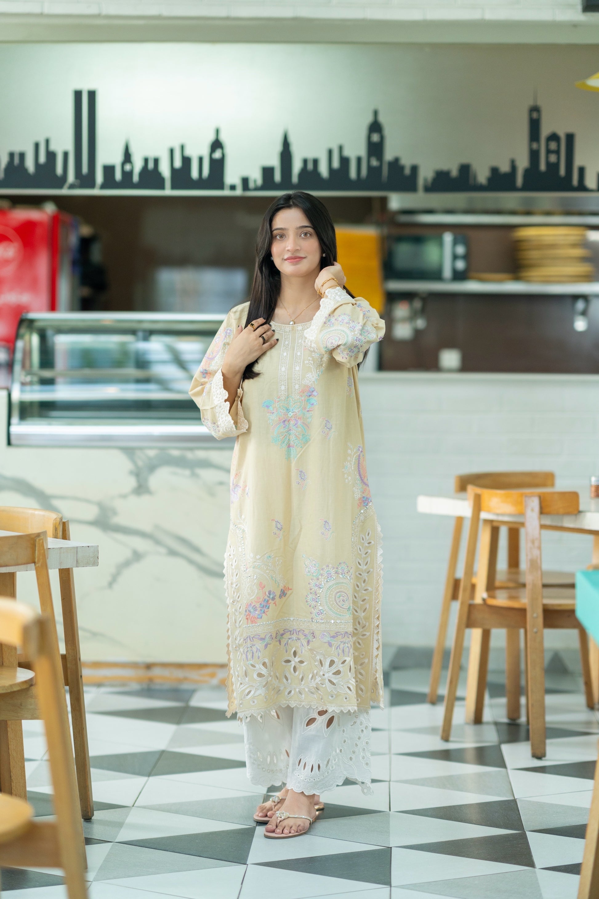 Description: Enhance your everyday look with our beautiful BEIGE-GOLD long kurta shirt and ivory pant fully hand cutwork with multi colors embroidered