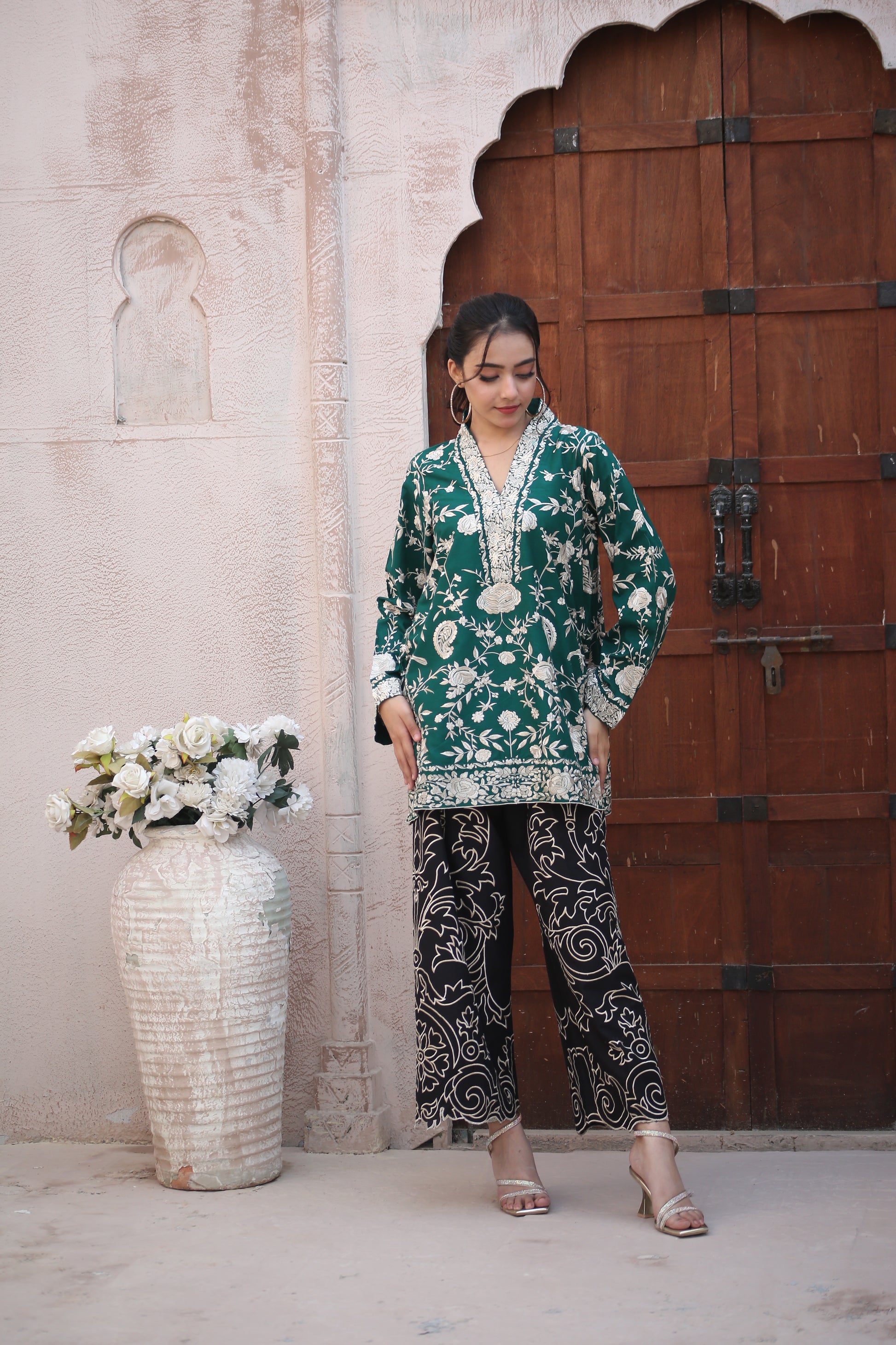 Description: Enhance your everyday look with our beautiful GREEN GHARA CO-ORD SHORT kurta shirt and pant fully hand cutwork with SELF COLOR embroidered