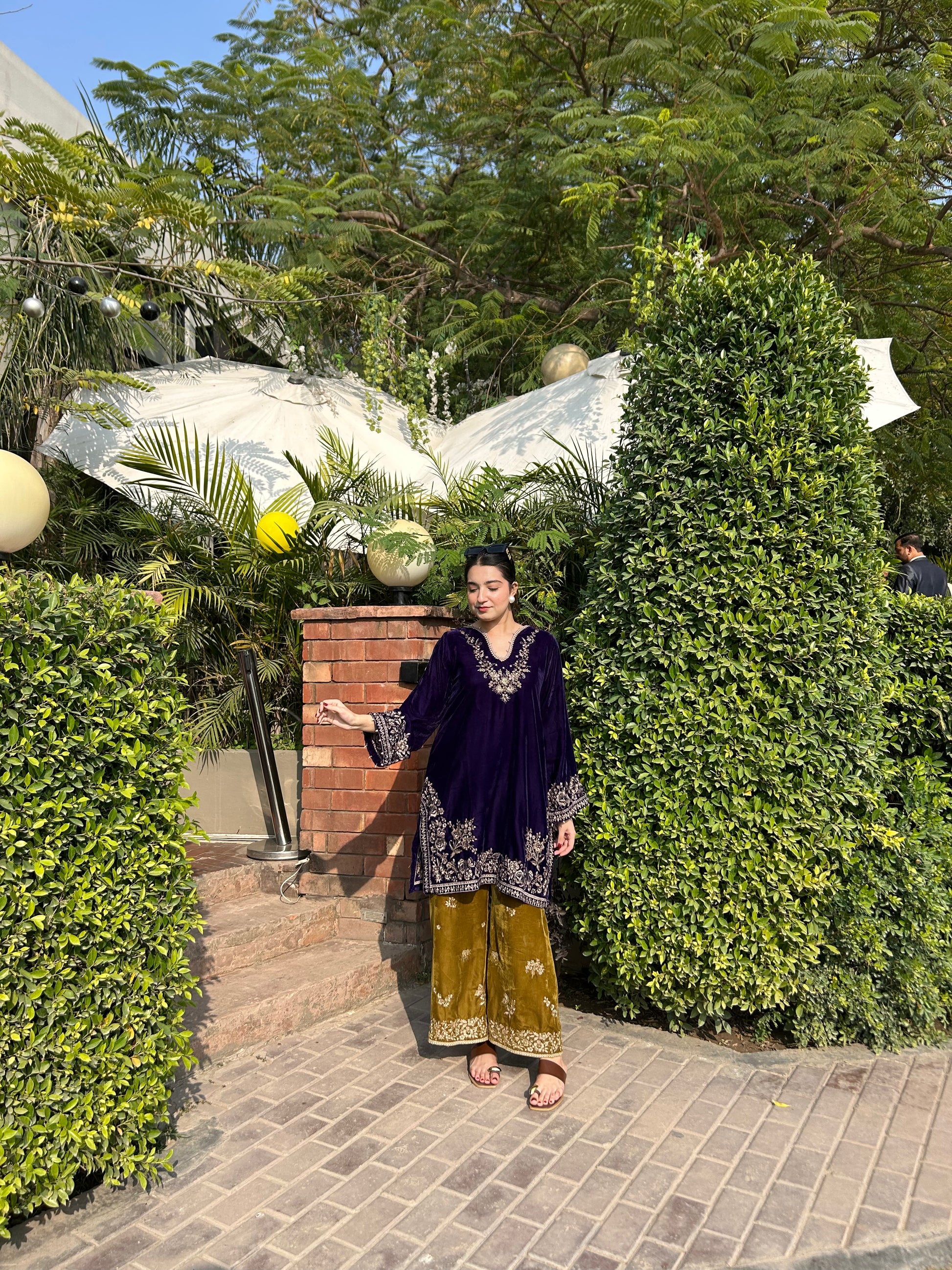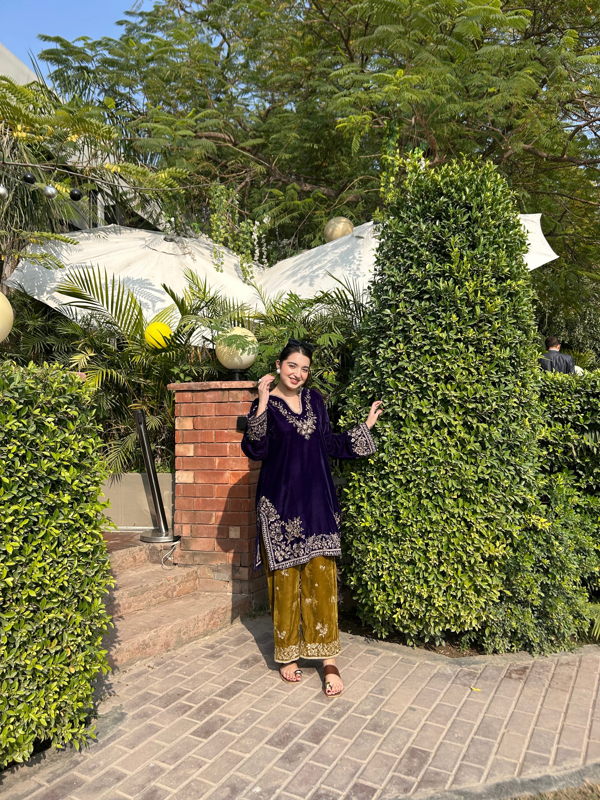 Description: ELEVATE YOUR WARDROBE WITH EFFORTLESS ELEGANCE VELVET CO-ORD SET DARK PURPLE & DARK MUSTARD EMBROIDERED FINISH WITH PEARLS AND TASSELS