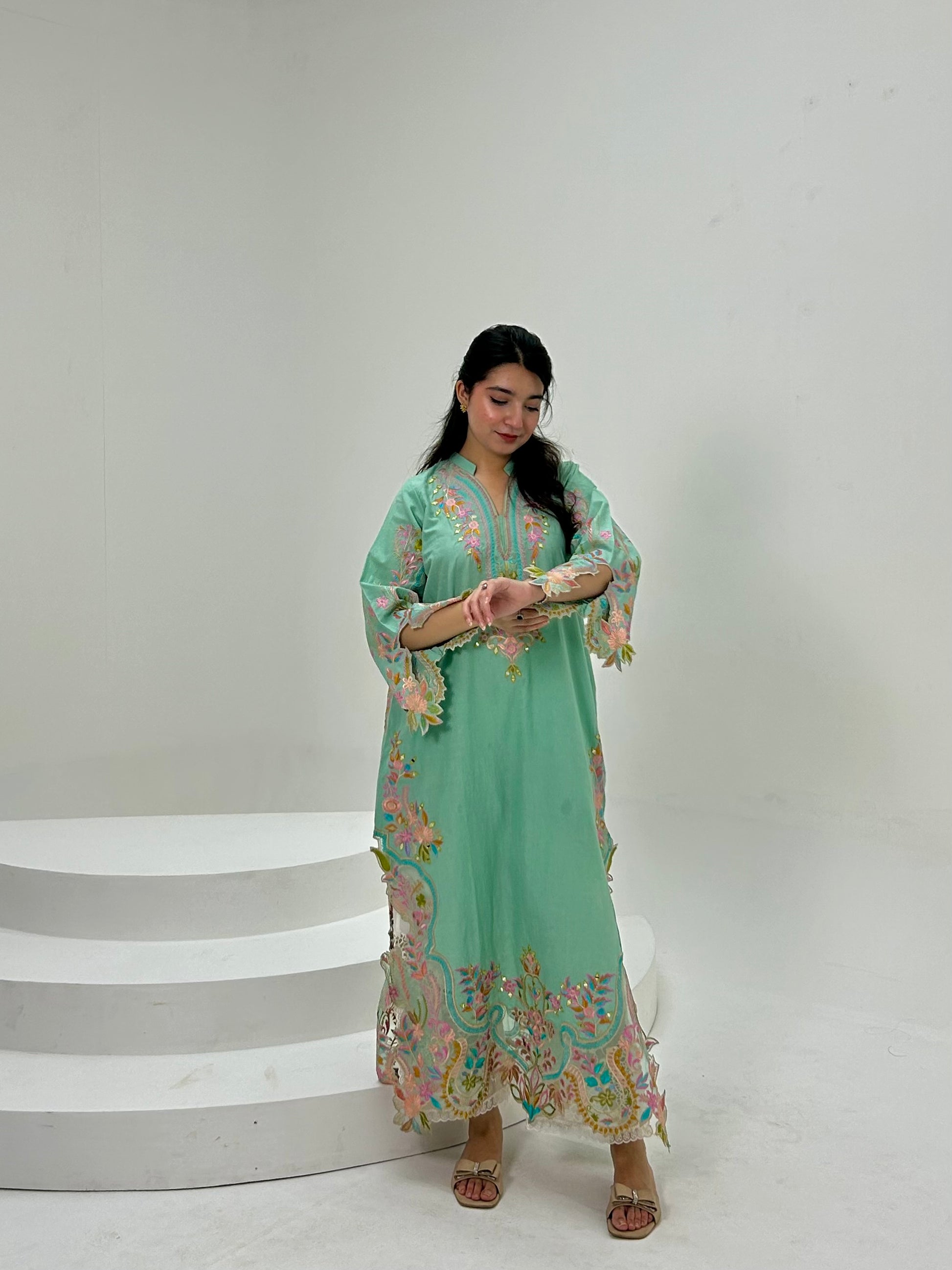 ( MEDIUM GREEN ) EMBROIDERED LONG LENGTH KURTA EMBROIDERED KURTA & PANT in Cotton With Thread Embroidery With mirror and cutwork on sleeves