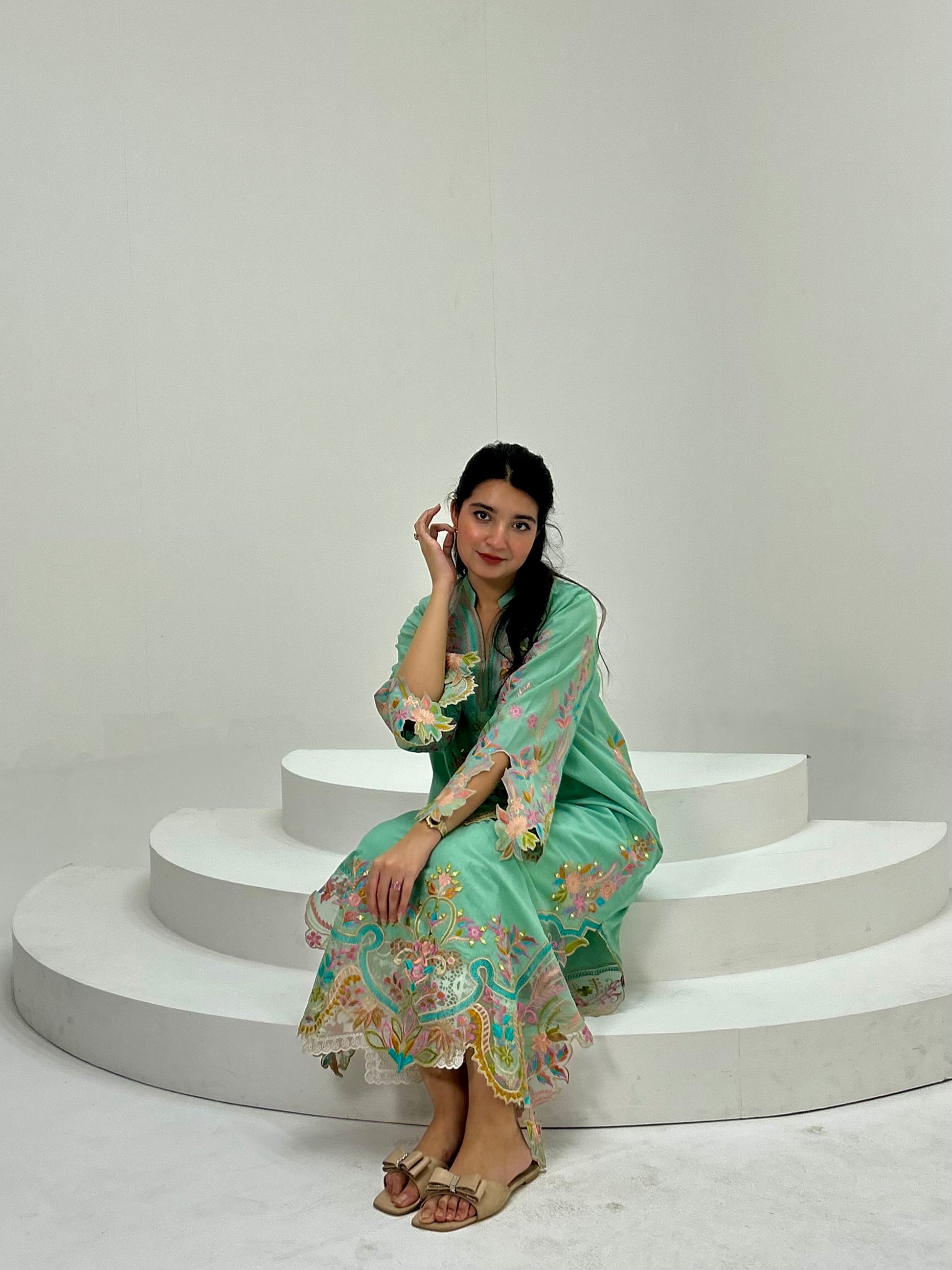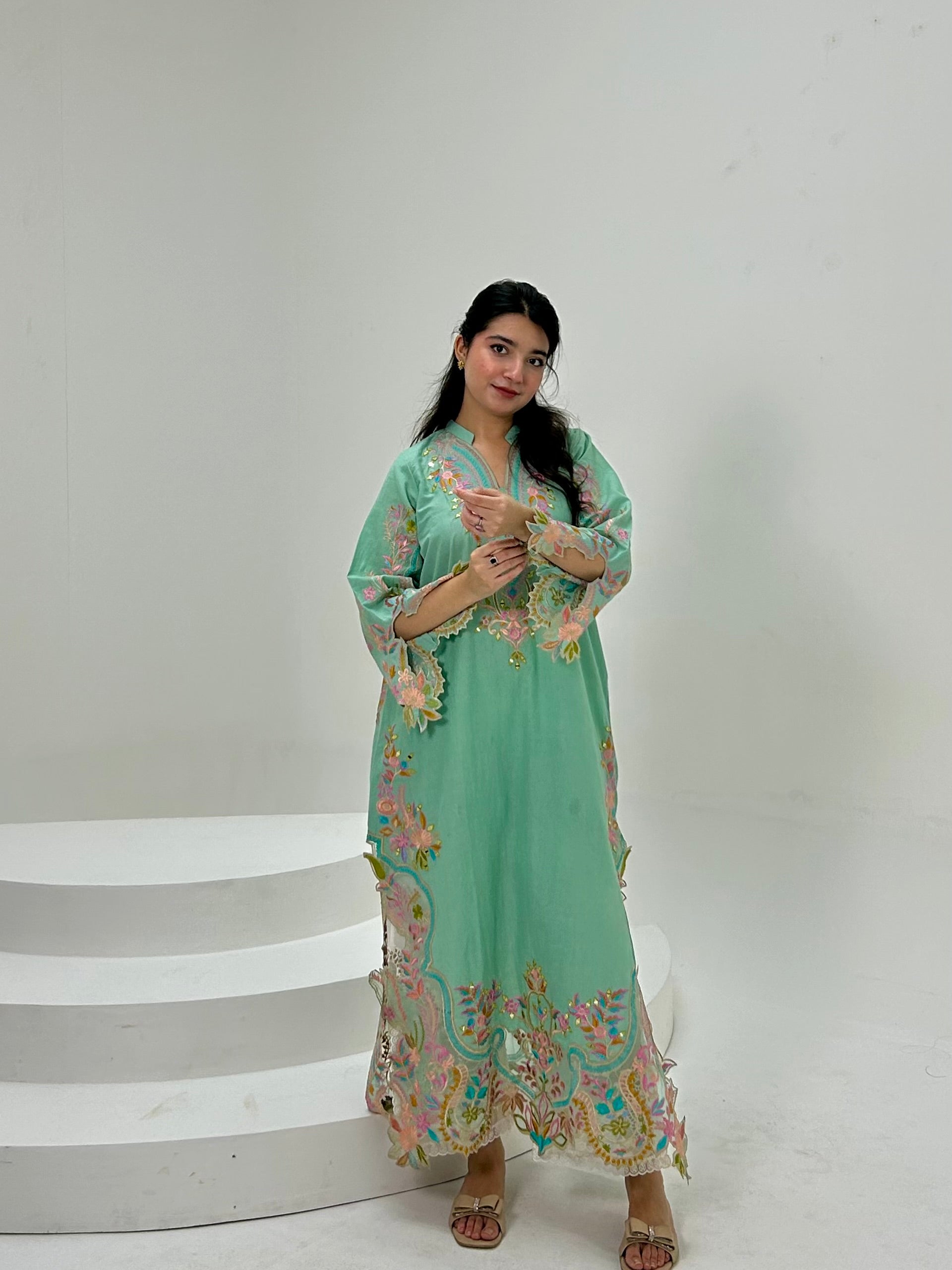 UNVEIL YOUR INNER DIVA WITH EVERY STITCH AND SILHOUETTE. WITH ( MEDIUM GREEN ) EMBROIDERED KURTA