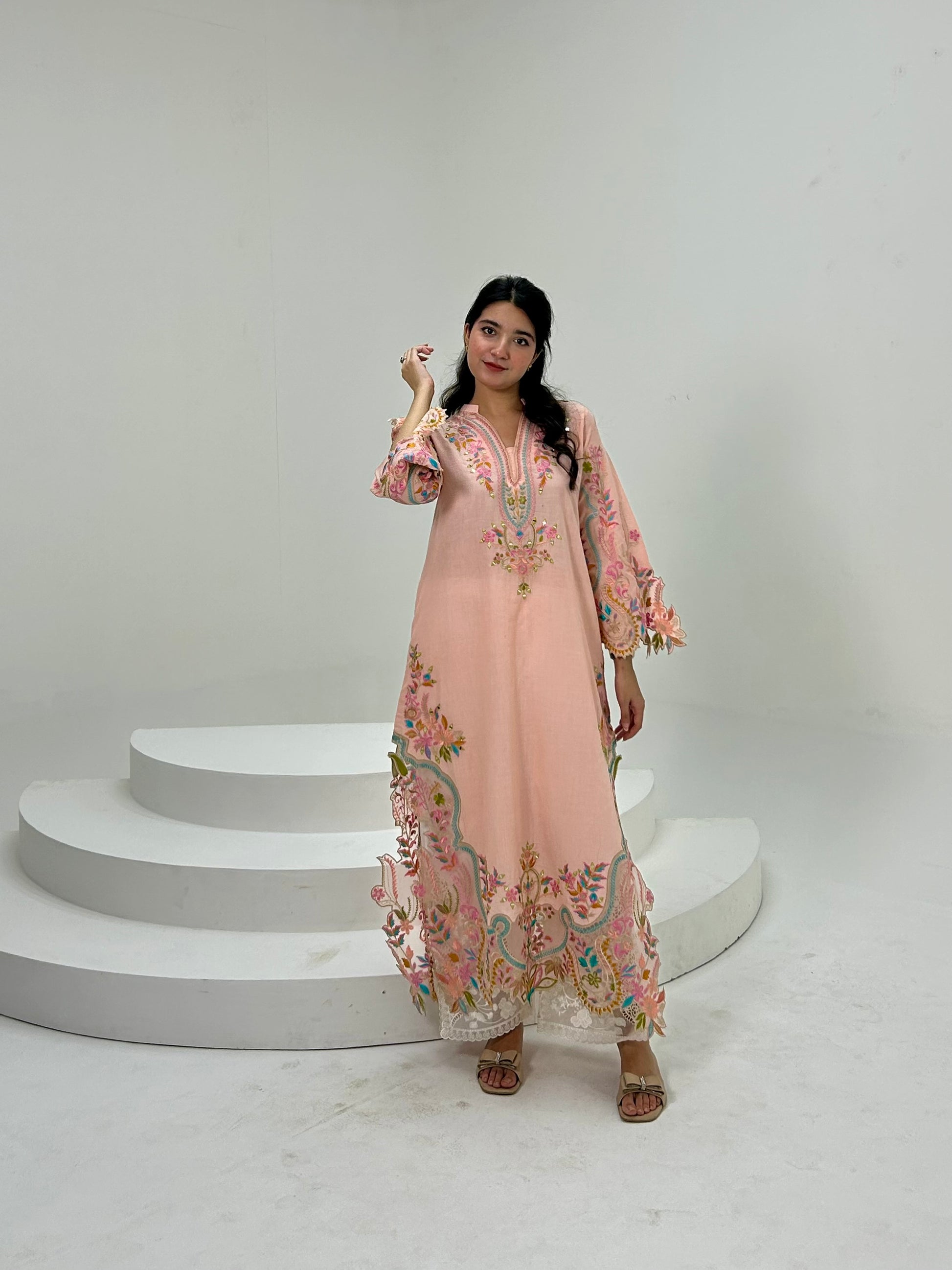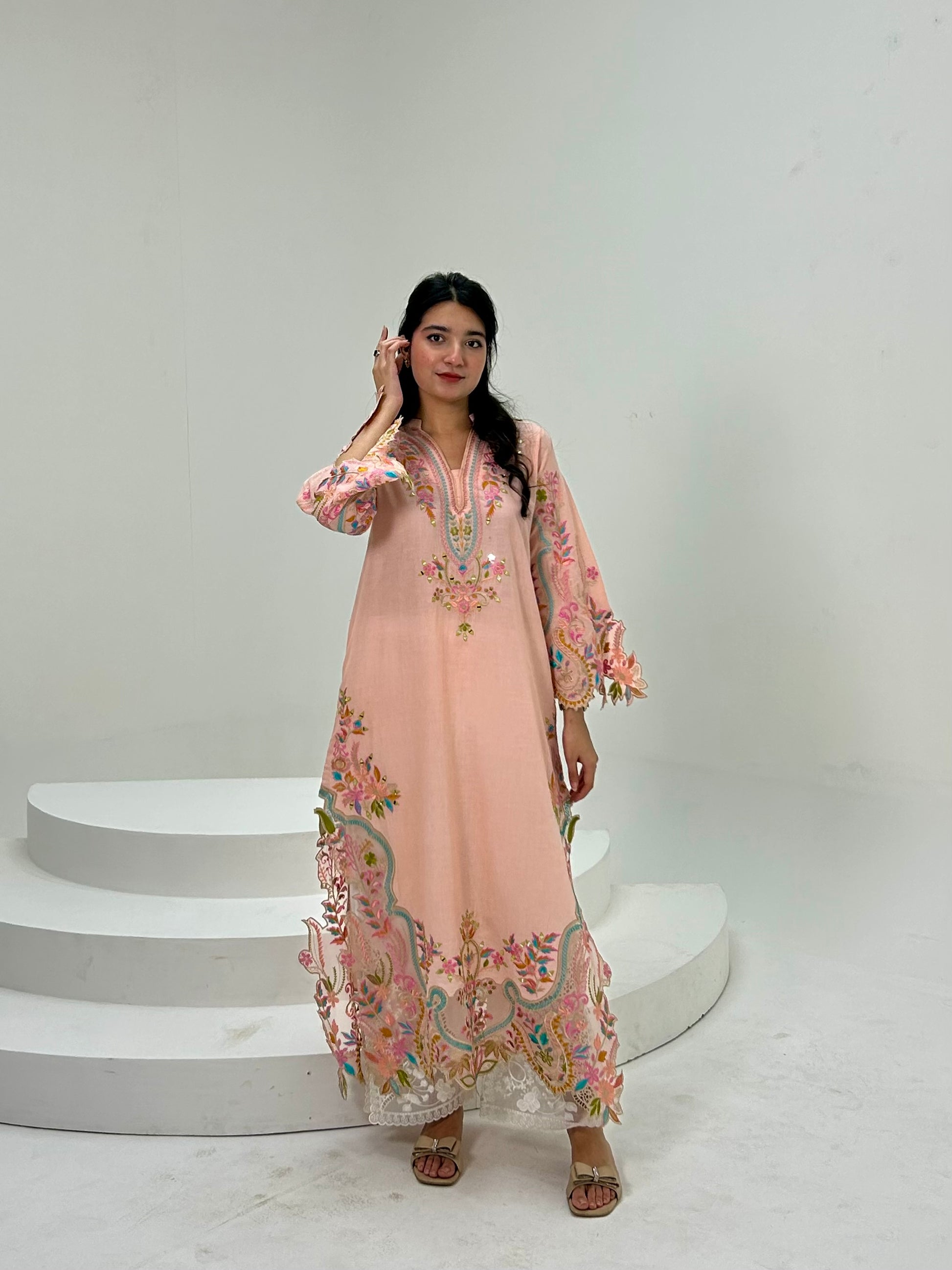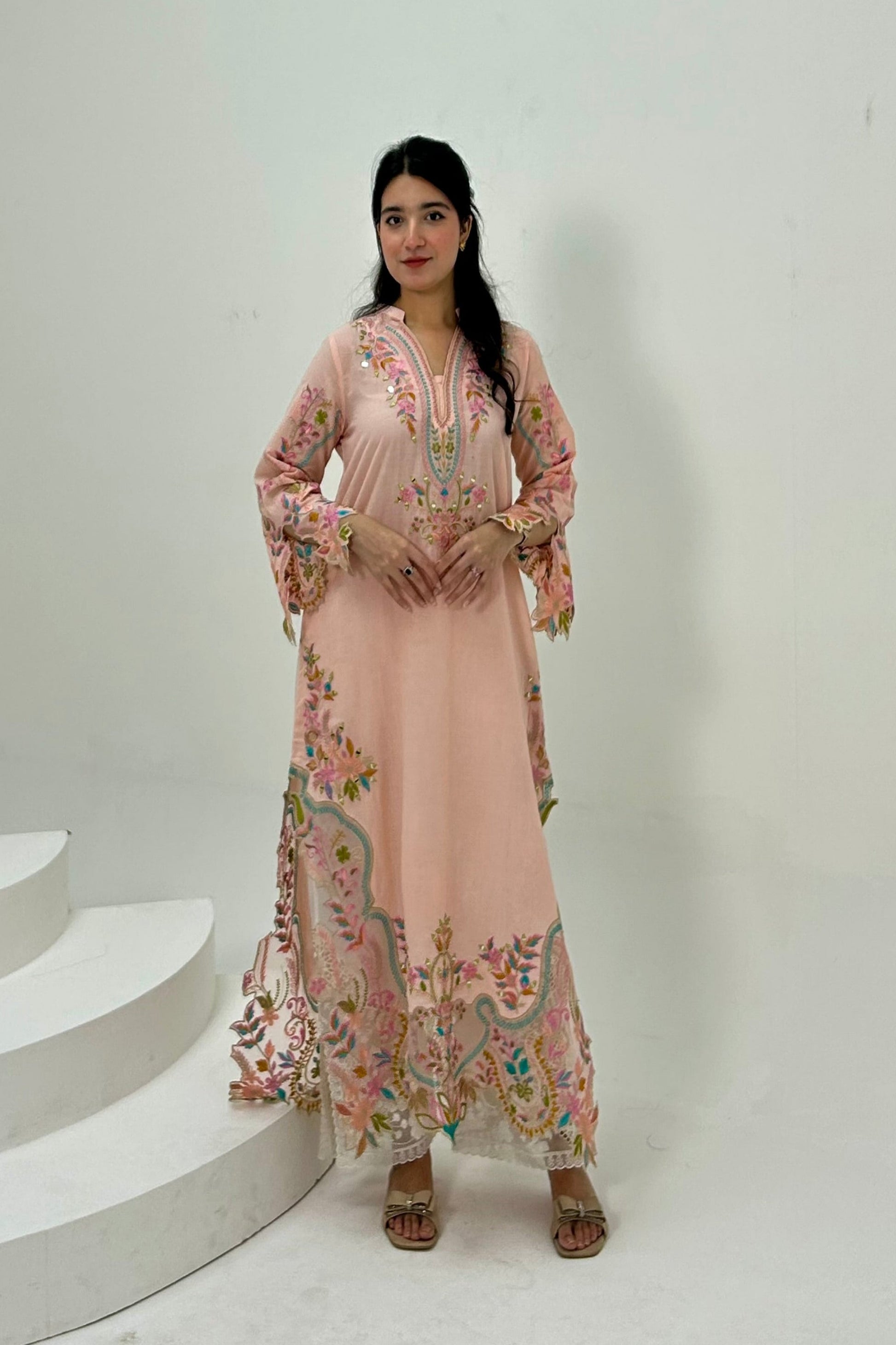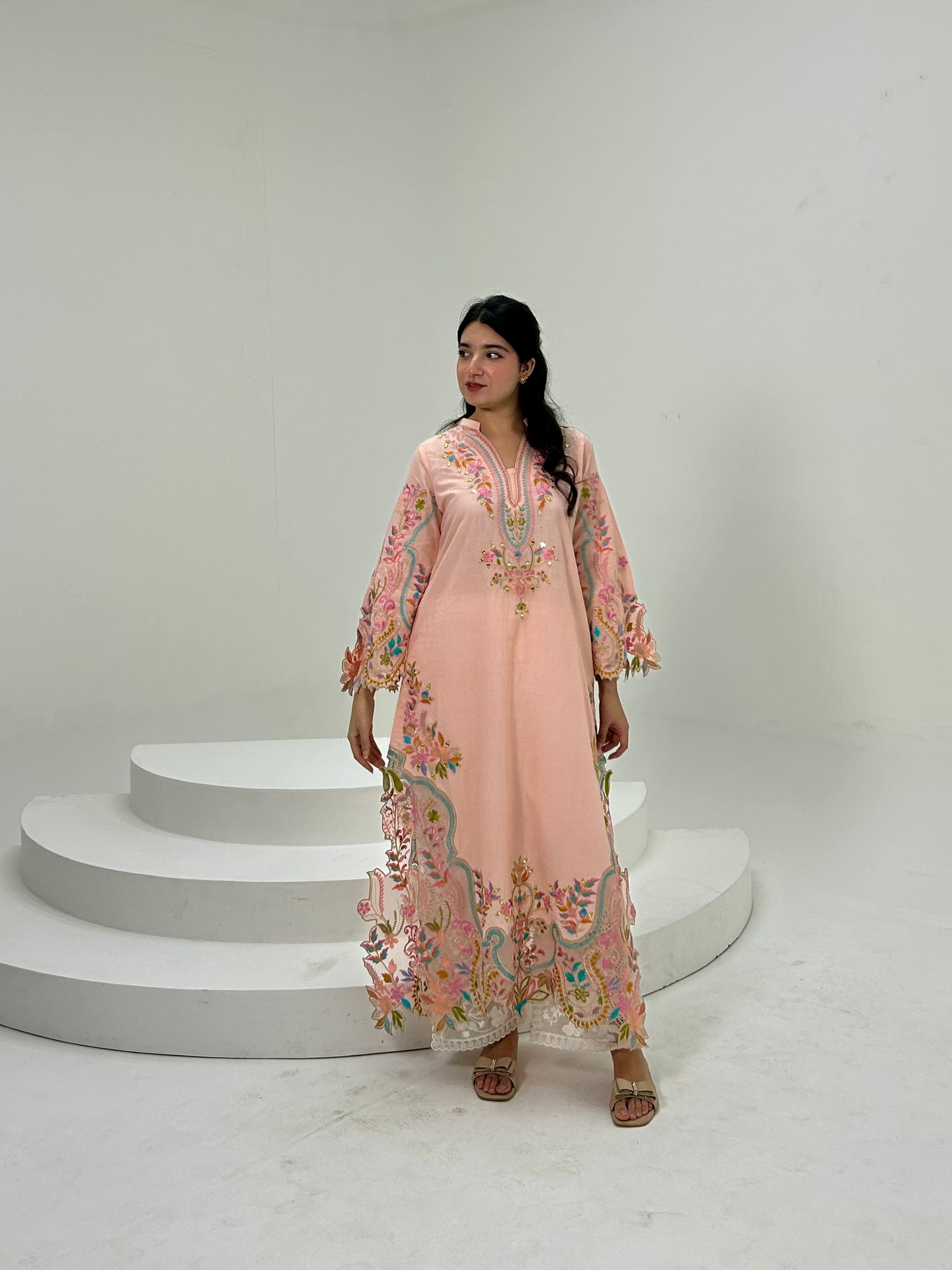 ( LIGHT PEACH ) EMBROIDERED LONG LENGTH KURTA EMBROIDERED KURTA & PANT in Cotton With Thread Embroidery With mirror and cutwork on sleeves