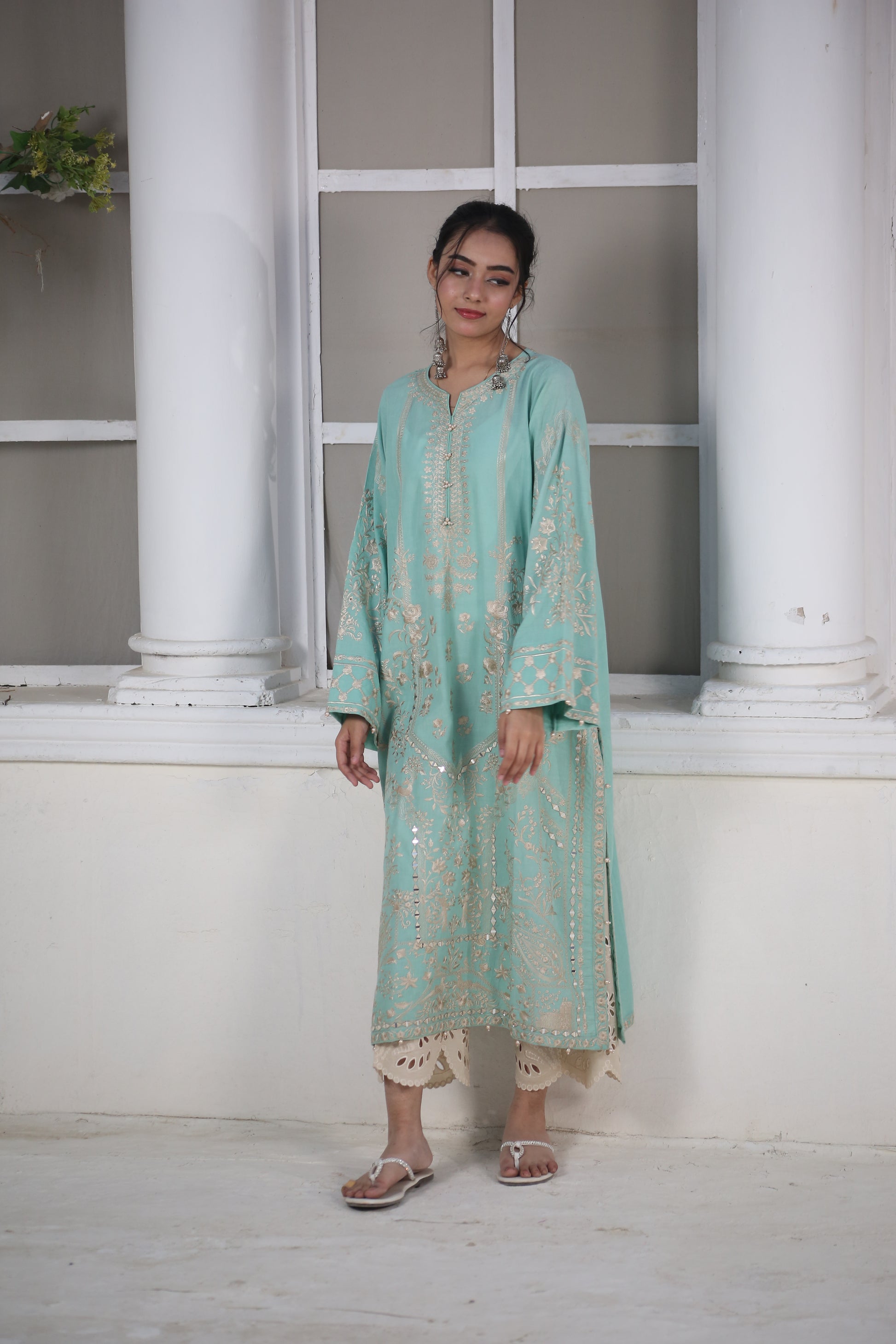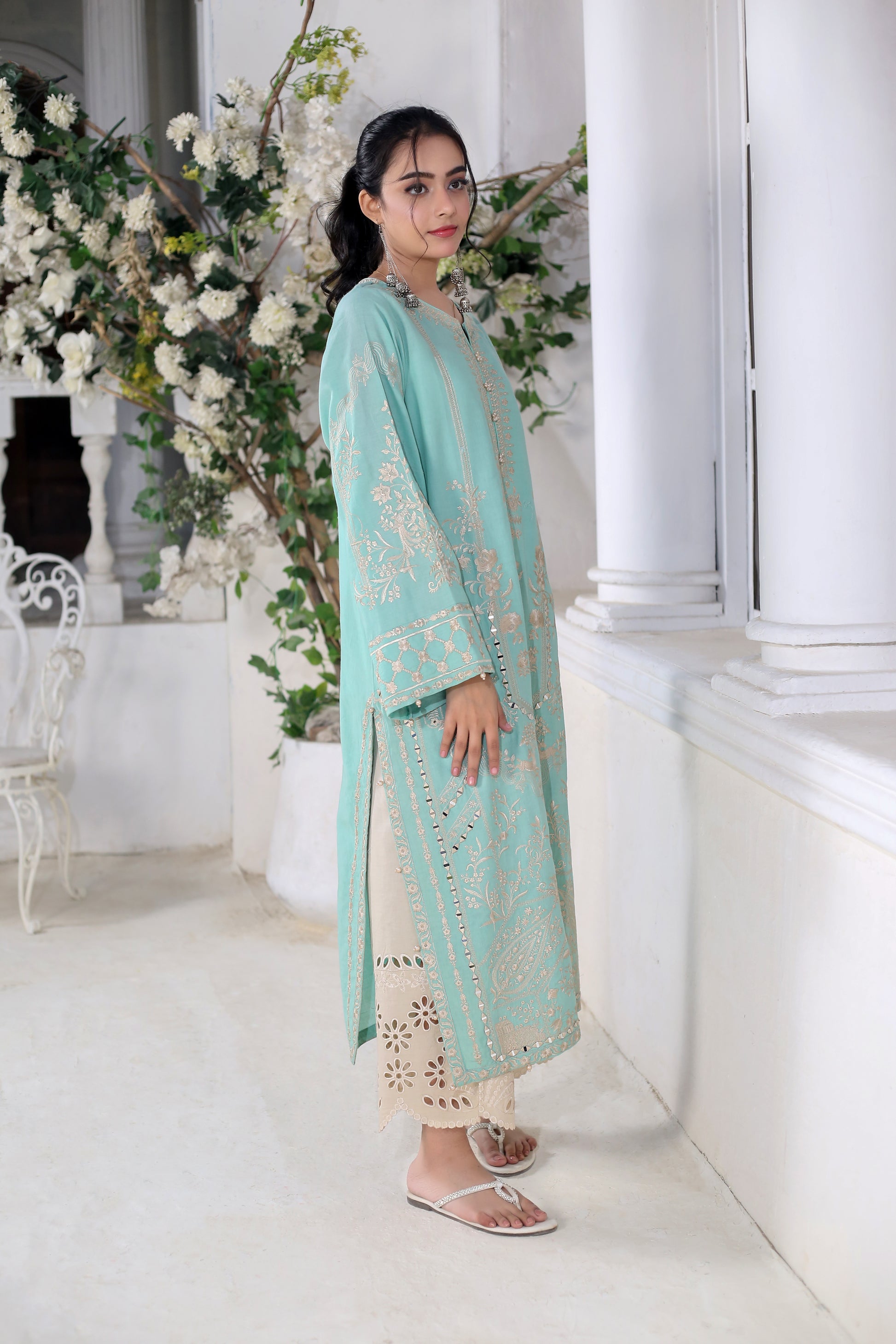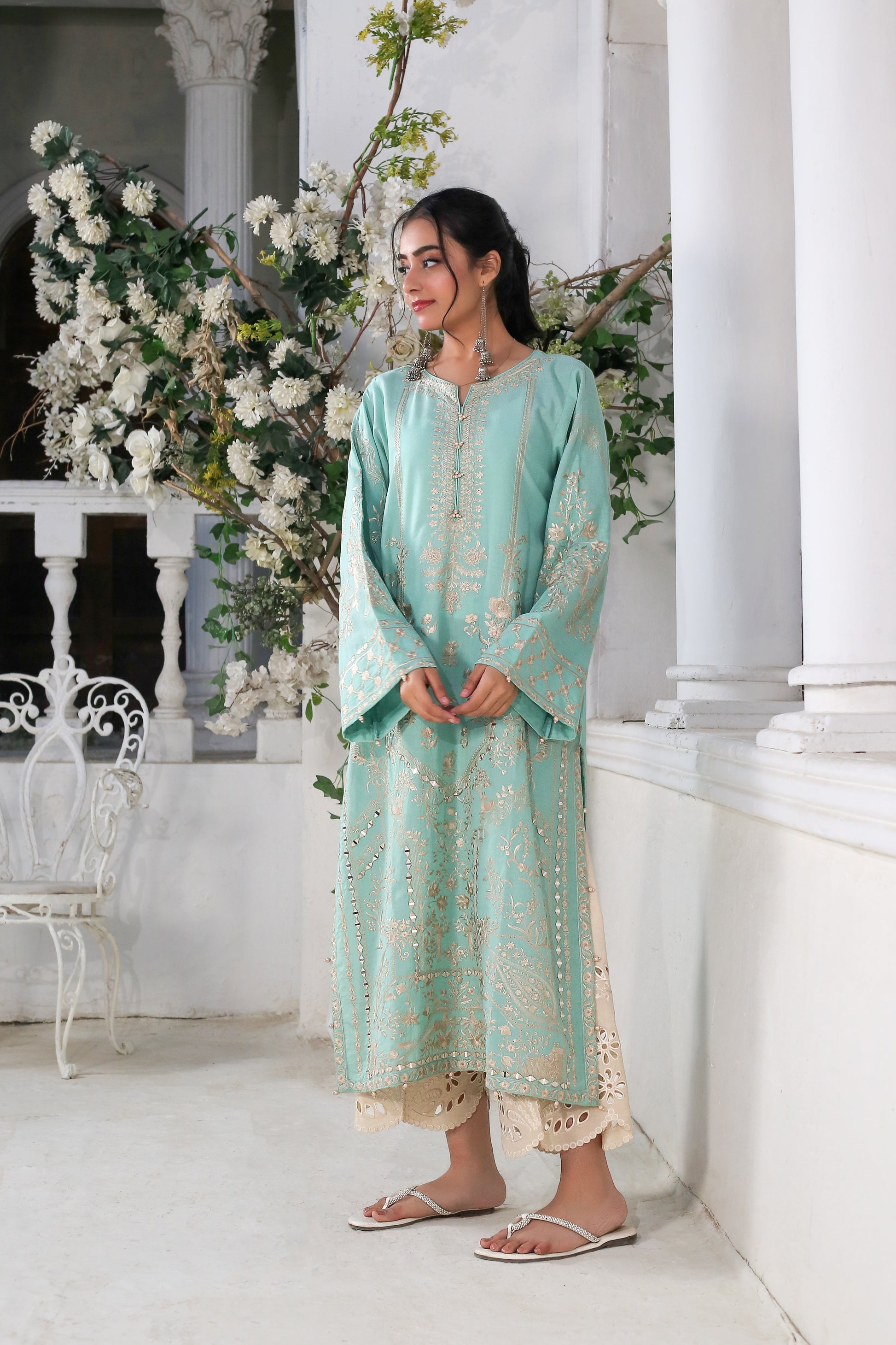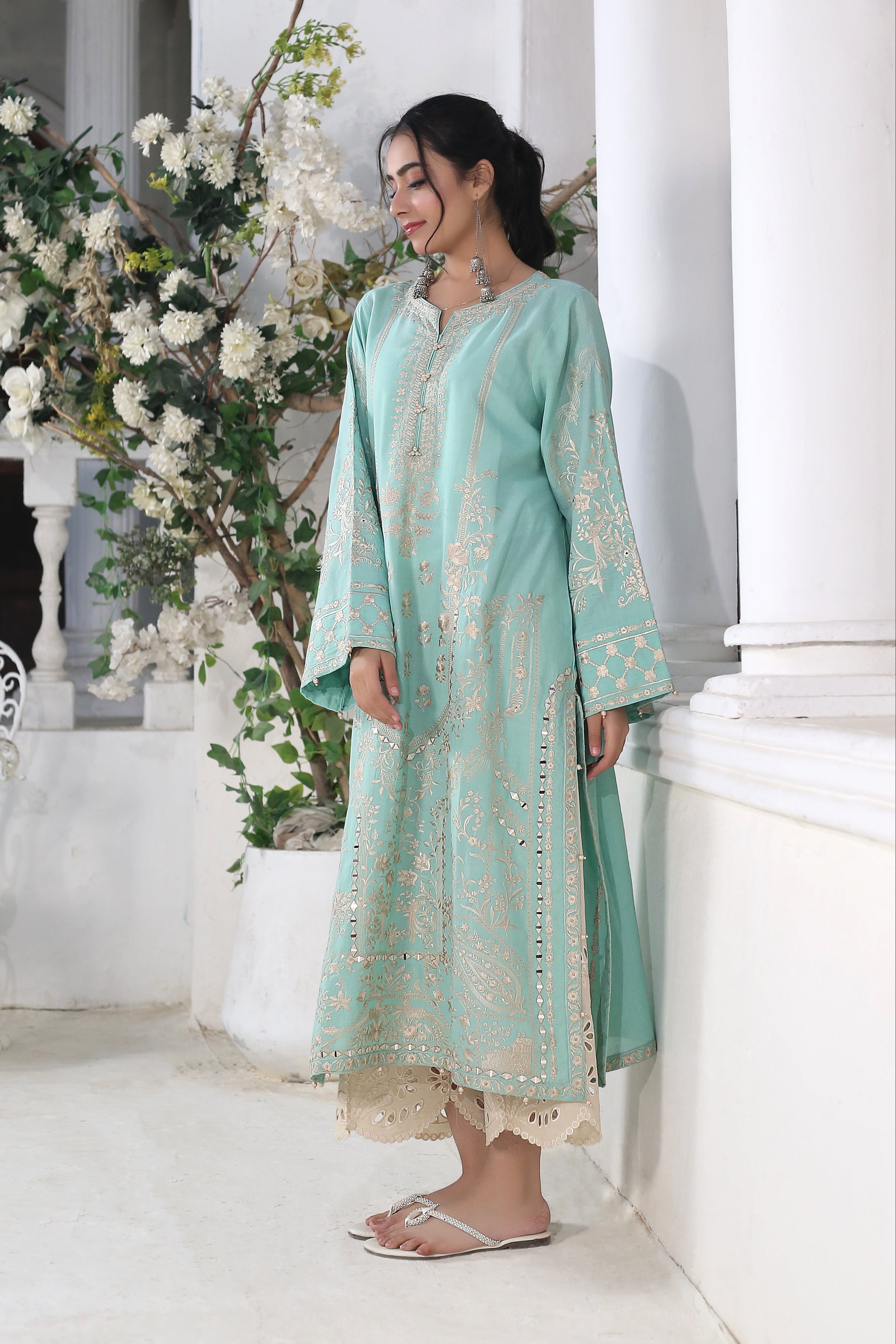 UNVEIL YOUR INNER DIVA WITH EVERY STITCH AND SILHOUETTE. WITH ( SOFT GREEN ) EMBROIDERED KURTA