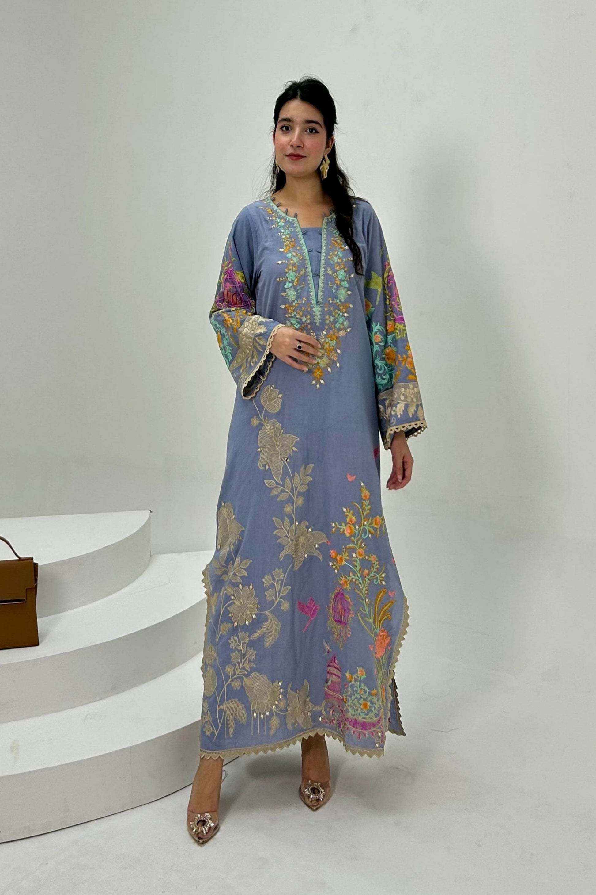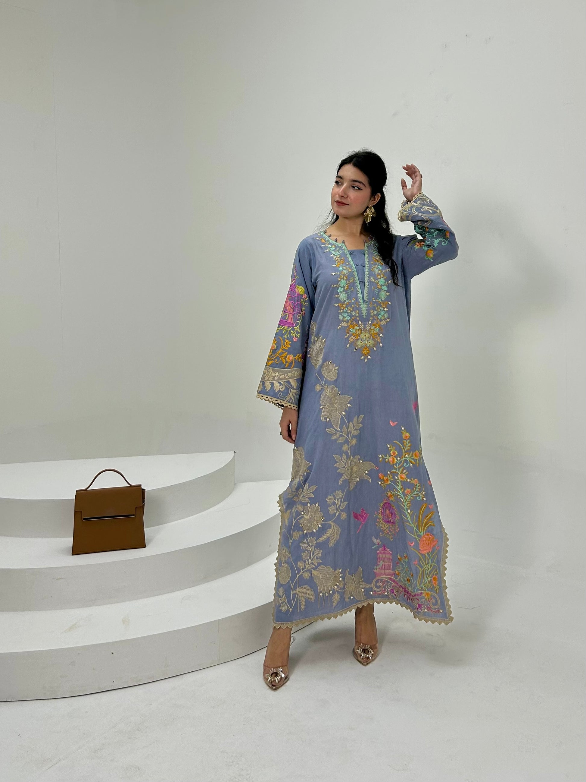 A long length kaftan 54 length beautifully crafted on cotton pure super quality very intricate embroidered kaftan with delicate cutwork finish WITH BLOCK PRINT