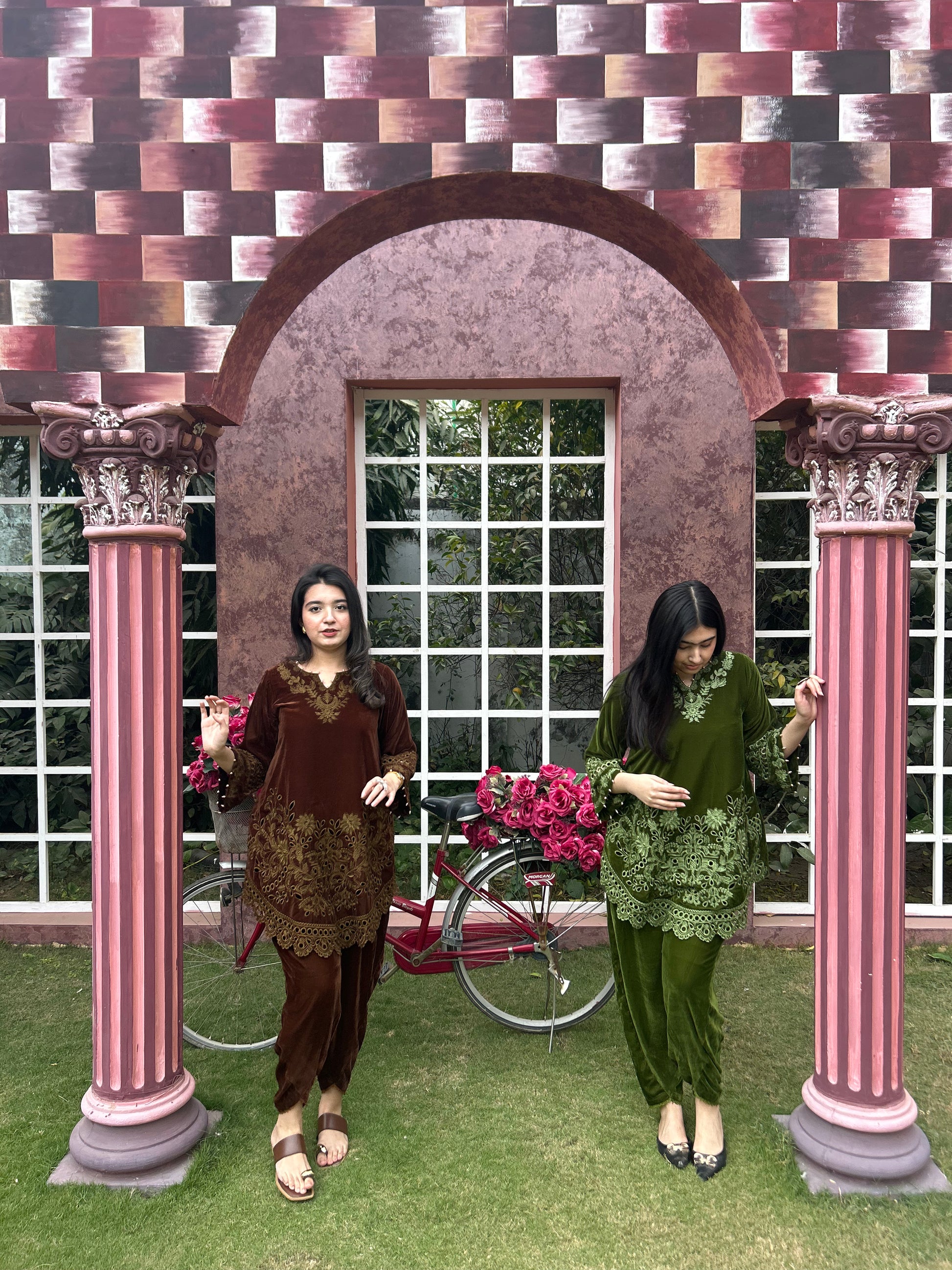 Description: Enhance your everyday look with our beautiful VELVET COFFEE CO-ORD SHORT kurta shirt and pant SHALWAR fully hand cutwork with SELF COLOR embroidered