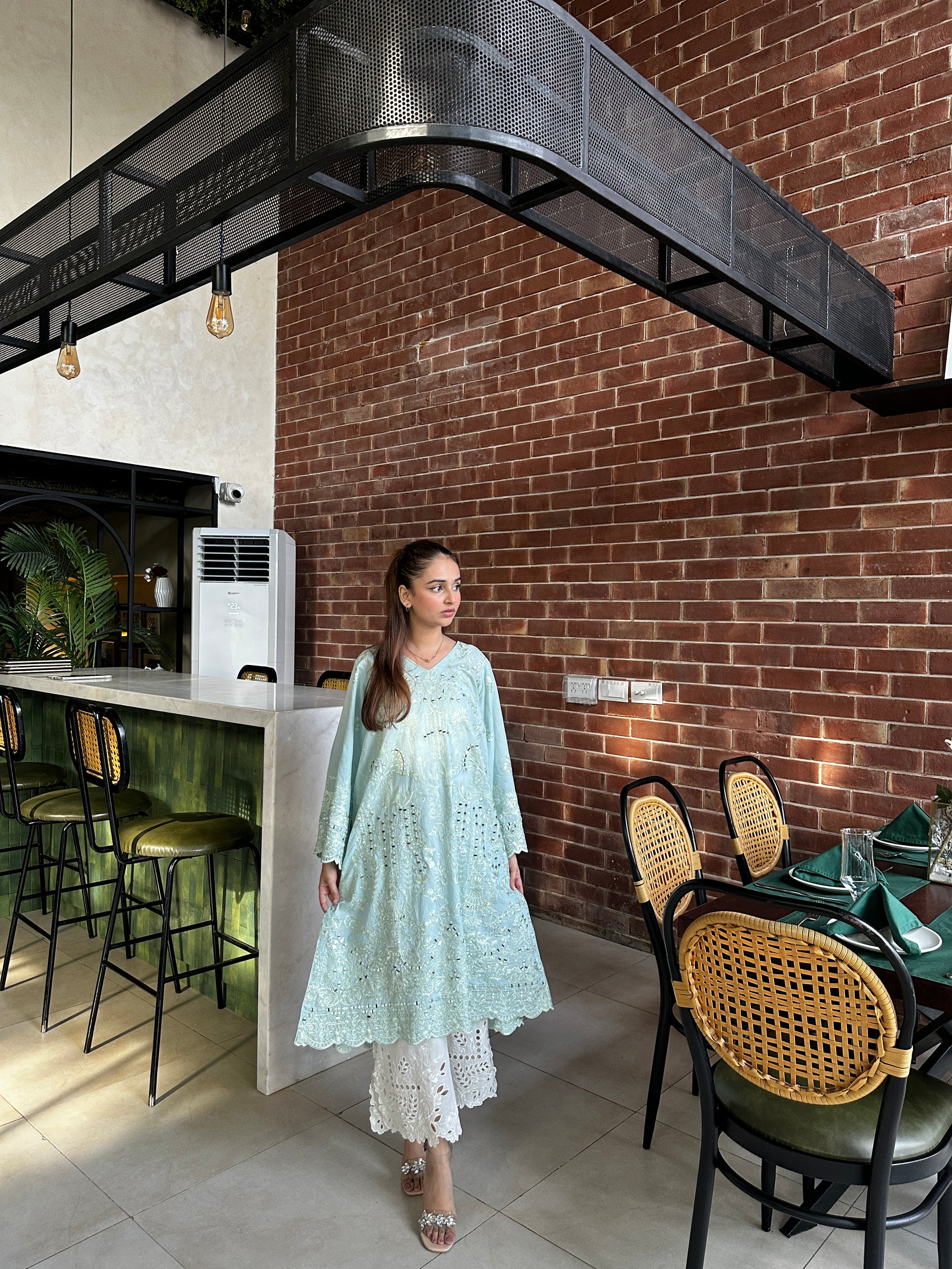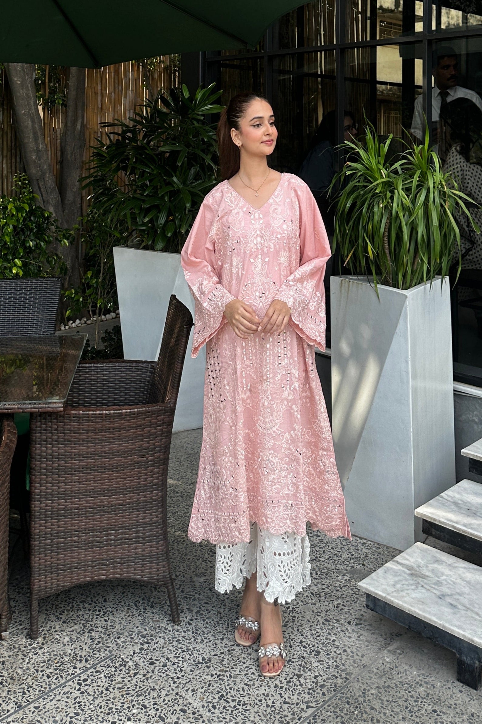 MELON PINK EMBROIDERED LONG LENGTH KURTA EMBROIDERED KURTA & PANT in Cotton With Thread Embroidery With mirror and cutwork on sleeves
